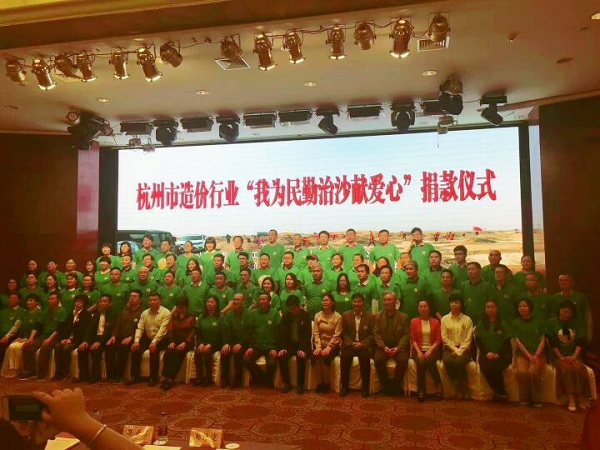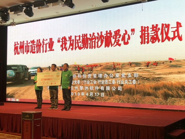 2019年4月17日,我司党支部书记、总经理蔡红伟参加杭州市造价行业组织的“我为民勤治沙献爱心”捐款仪式,并向与会企业代表发出了捐款倡议。蔡总在会上表示,全国生态一盘棋,杭州的碧水蓝天需要民勤的绿色守护,作为造价人理应用自己的实际行动践行十九大提出的“人与自然和谐共生”精神,助力民勤“鏖战沙魔,保护家园”,发挥全行业的力量,一年接着一年干,“杭州建设造价林”定能不断壮大,祝愿民勤早日重现沙漠绿洲,成为“丝绸之路”上的一颗璀璨明珠。