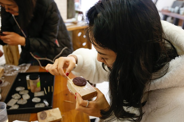 在认真聆听了老师对香文化以及制香流程的讲解之后,大家纷纷兴致勃勃地动起手来,通过和香料、磨香粉、拌香料、捣香泥、压香牌,打磨等十几道工序,感受自己亲手制作的香牌,并通过自己的创意做成项链、胸牌、挂饰、车挂、包挂、手链等,收获了香气十足的踏实感。