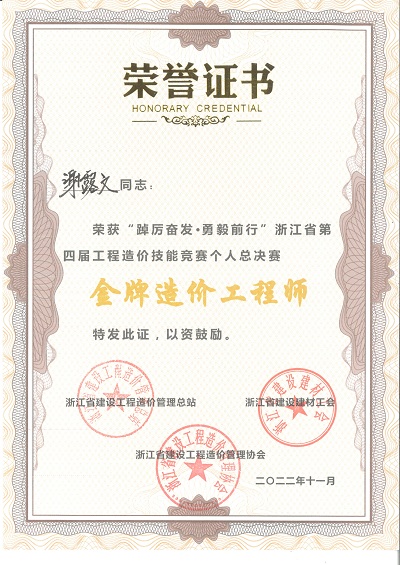 我司选手谢露文、孙玉琴经过初赛、预赛层层选拔,从7000名造价从业选手中脱颖而出,最终晋级个人组决赛。谢露文还加入了杭州三人组代表队,代表杭州队参加了11个地市团队赛的角逐。最终,杭州代表队夺得团体一等奖,我司荣获“最佳风采奖”,谢露文个人还荣获了“金牌造价师”称号。