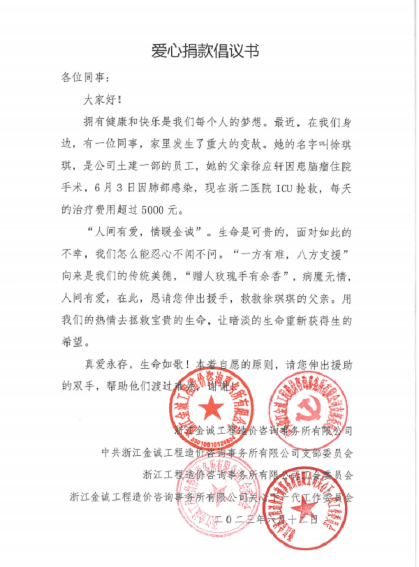 2023年6月,公司员工徐琪琪的父亲因脑瘤手术并发症,造成肺部感染住进ICU抢救,这对工作才两年的她无疑是晴天霹雳,面对高昂的医疗费,家庭已经无力承担。公司得悉这一情况后,迅速召开了帮扶困难员工讨论会,第一时间发出捐款倡议,组织发起了“人间有爱 情暖金诚”爱心捐款活动,倡议全体员工伸出援手,帮她一起渡过难关。