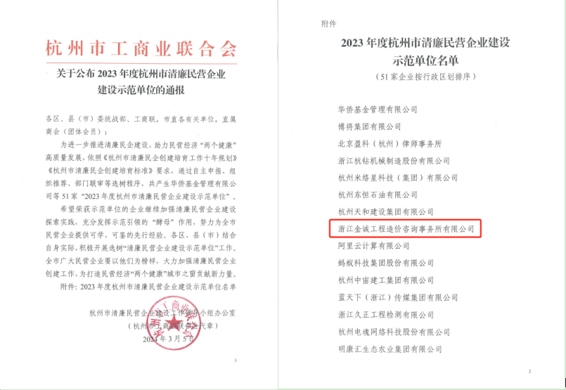 我司荣获“杭州市清廉民营企业建设示范单位”荣誉,“党建引领树品牌,清廉造价促发展”特色做法入选了“杭州市清廉民营企业建设示范单位特色做法”材料汇编。