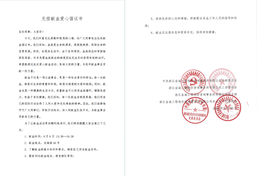 我司历来热心公益事业,注重社会责任。无偿献血作为一项利国利民的公益性事业,是一项关系到社会和谐稳定、家庭幸福安康的民生工程,更是一座城市文明进步的标志。今后,我司将持续助力各项公益事业,积极承担社会责任,号召更多的公司员工参与无偿献血、贫困帮扶、文明城市建设等公益活动,为社会奉献爱心,积极展现企业的责任与担当。