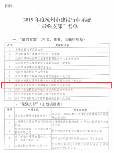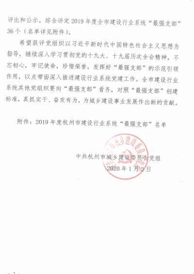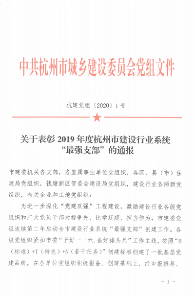 由中共杭州市城乡建设委员会举办的2019年全市建设行业系统“最强支部”创建,经申报推荐、资格复审、评比和公示,综合评定出36家“最强支部”。我司党支部光荣上榜,荣获2019年度杭州市建设行业系统“最强支部”(机关、事业、两新类)。